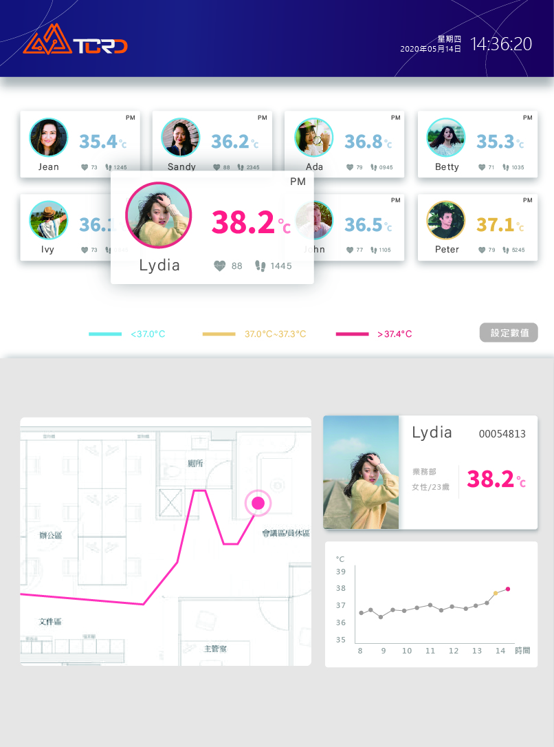 Company: Add "IoT Gateway System" at the main entrances and exits to automatically detect and display body temperature information in real time on the screen when personnel enter and exit, and to obtain real-time body temperature information of employees within 24 hours of the office to provide control personnel Fast and efficient identification.
