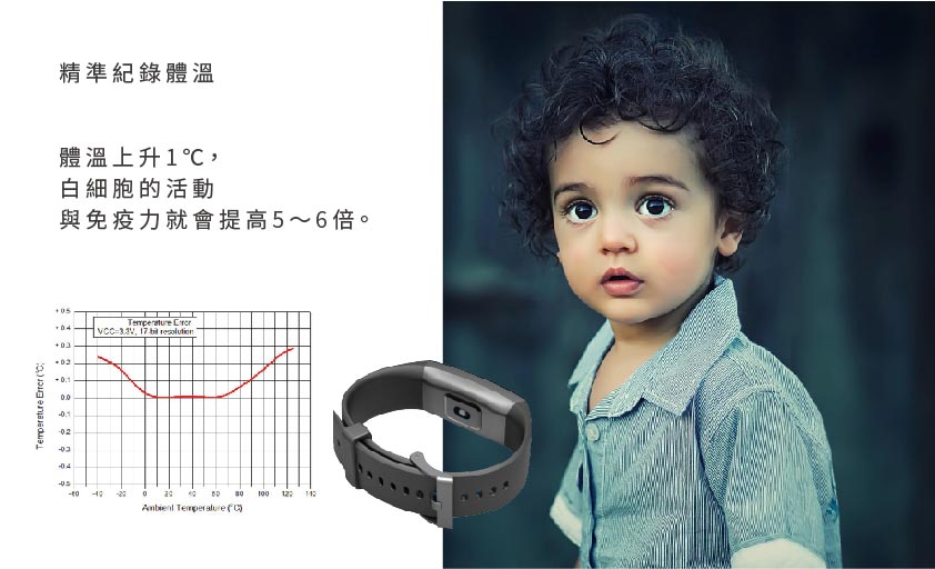 In addition to the general smart bracelet functions, the "smart somatosensory bracelet" also uses the world's smallest CMOS digital-analog hybrid zero static power temperature sensor chip, and its high-precision temperature probe has a minimum resolution of plus or minus 0.1 degrees error. And through the built-in "body temperature warning setting function" to reach 24H warning reminder.